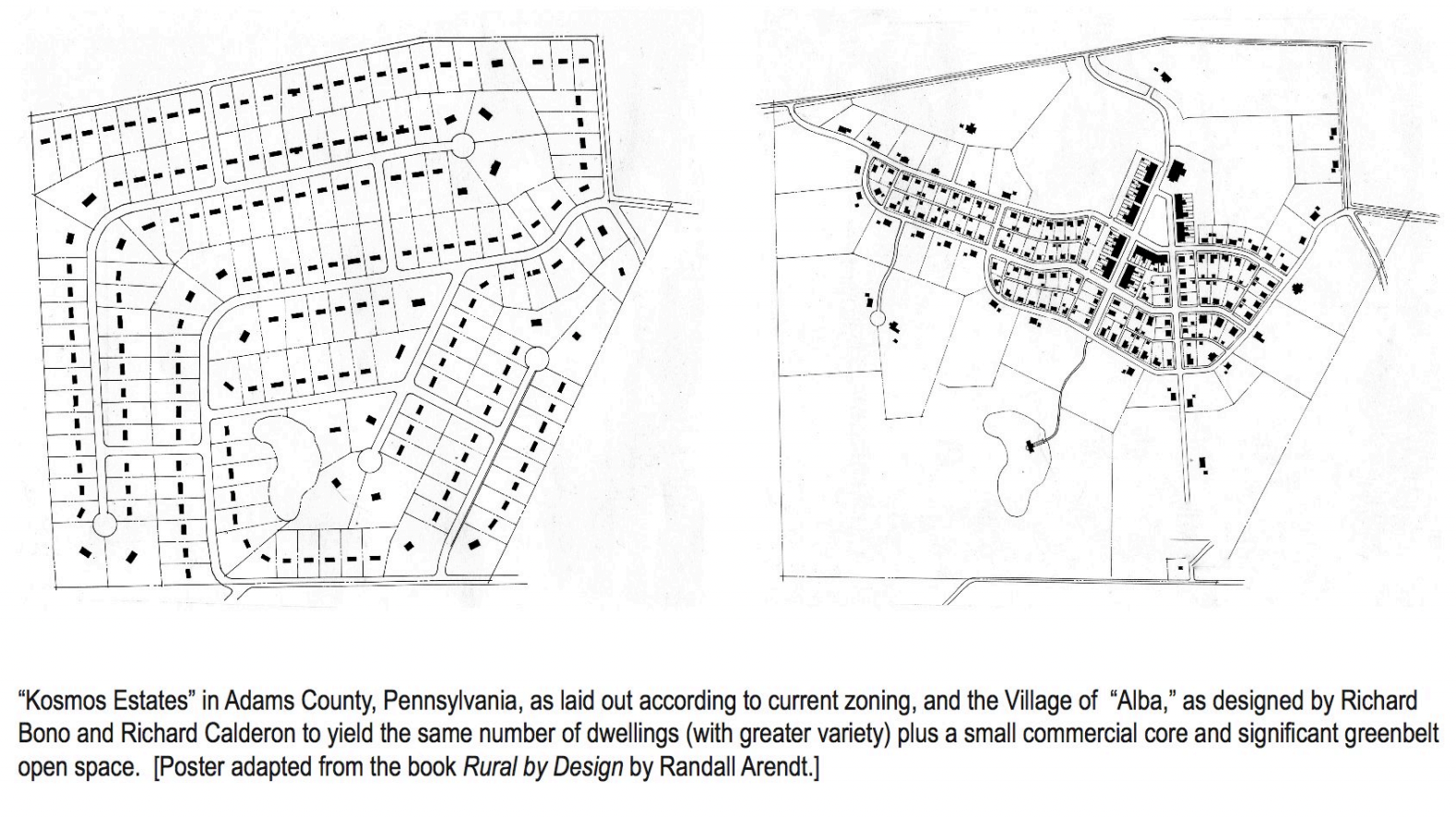 Below, on the left, you can see a neighborhood laid out according to typical current zoning protocols. On the right, you can see the same amount of land with the same amount of dwellings, plus a small commercial core and a significant greenbelt open space.